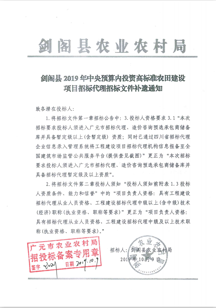 2019劍閣中央預(yù)算內(nèi)高校準(zhǔn)農(nóng)田建設(shè)代理招標(biāo)補遺通知.pdf