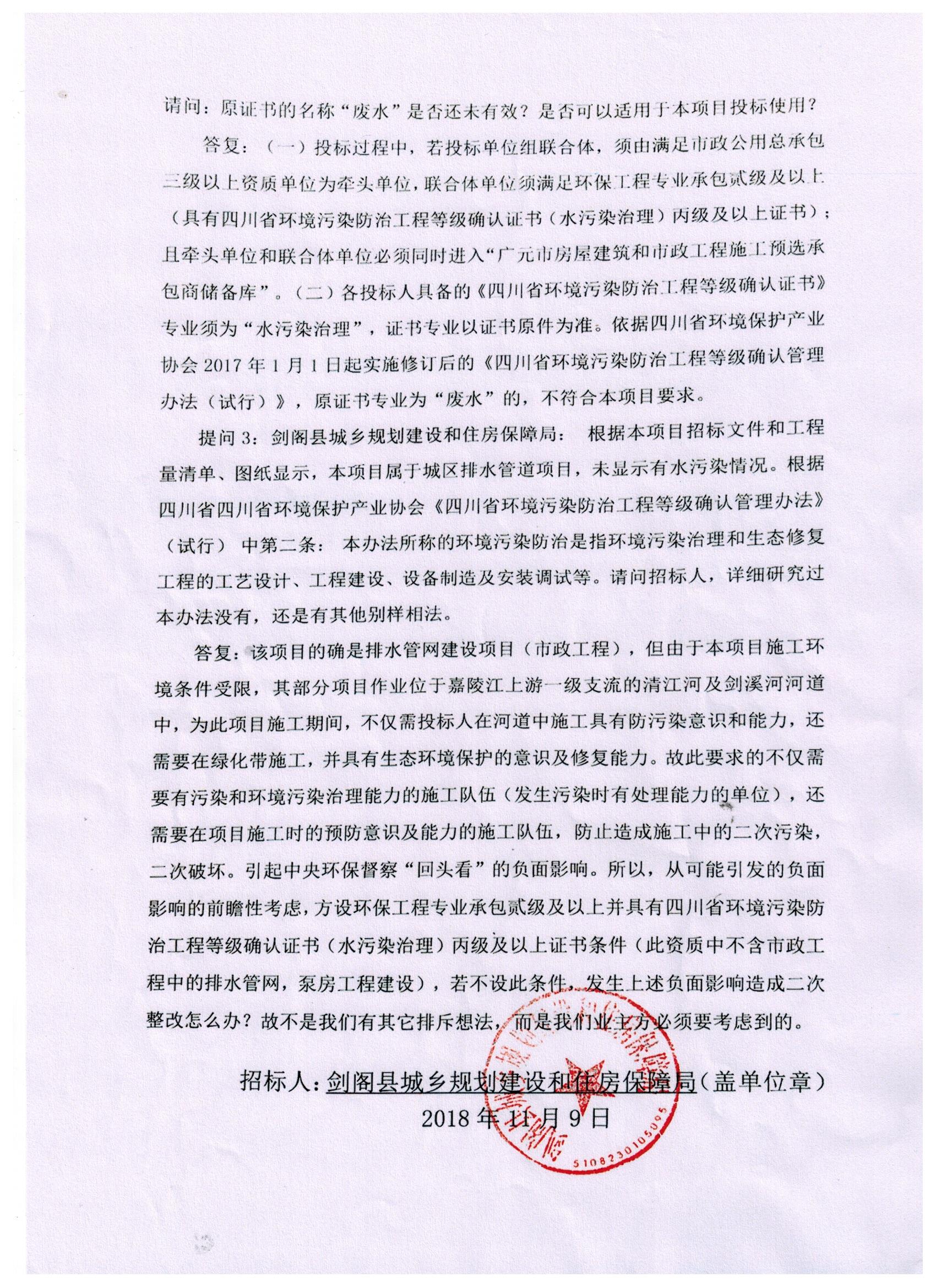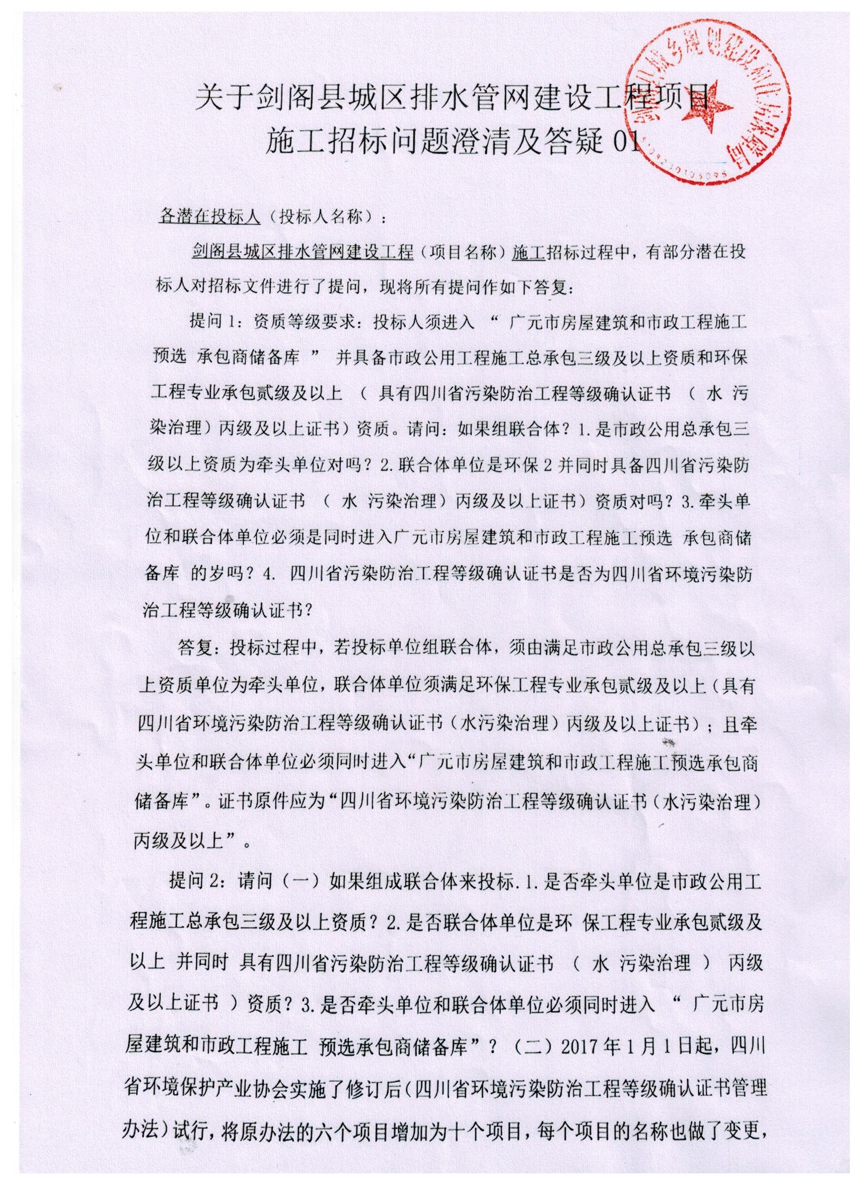 劍閣縣城區(qū)排水管網建設工程項目施工招標問題澄清及答疑