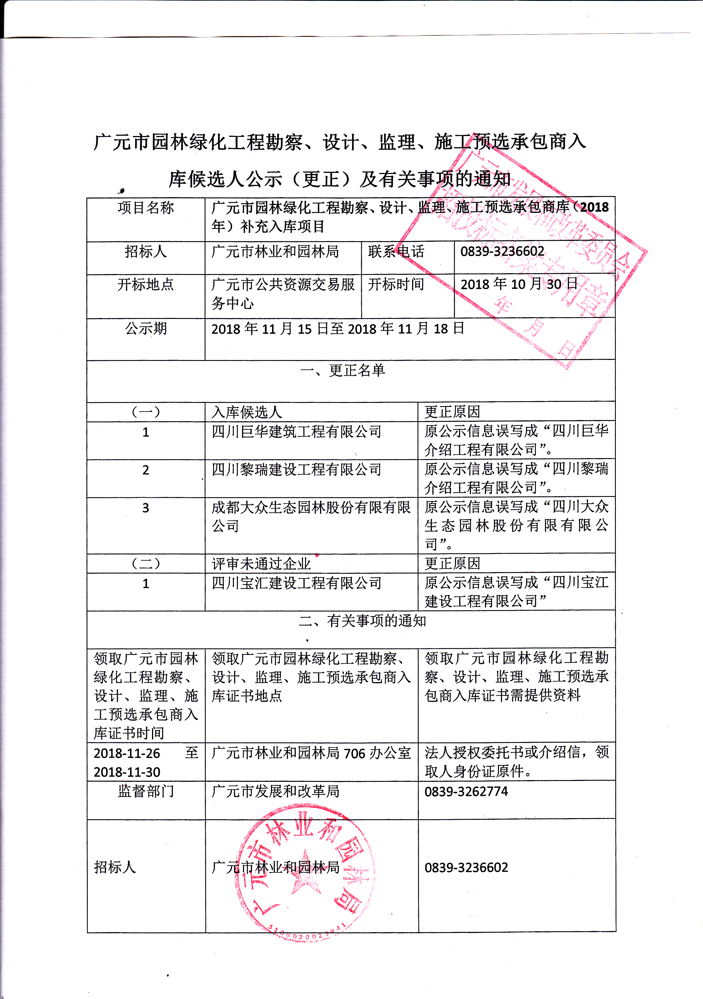 廣元市園林綠化工程勘察、設(shè)計(jì)、監(jiān)理、施工預(yù)選承包商入庫候選人公示(更正)及有關(guān)事項(xiàng)的通知