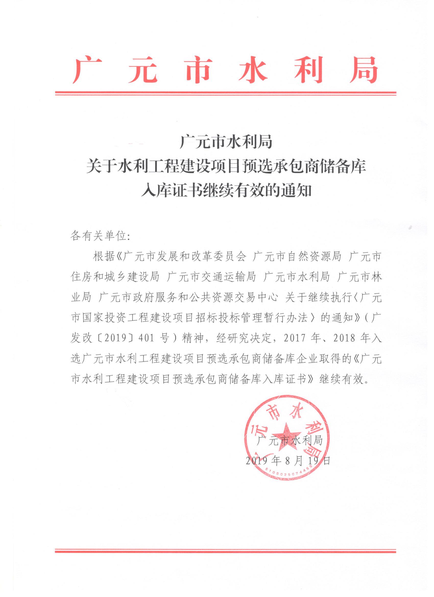 關(guān)于水利工程建設(shè)項(xiàng)目預(yù)選承包商儲備庫入庫證書繼續(xù)有效的通知
